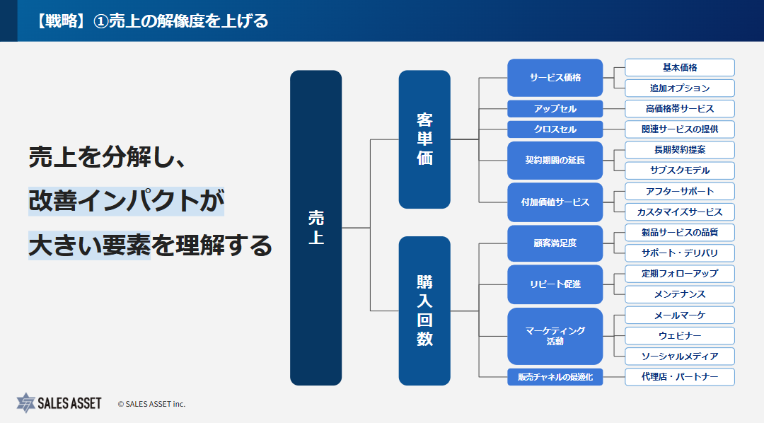 このように細かく分解することで、どの要素が売上に最も影響を与えているかが明確になり、改善のインパクトが大きい要素を特定できるようになります。